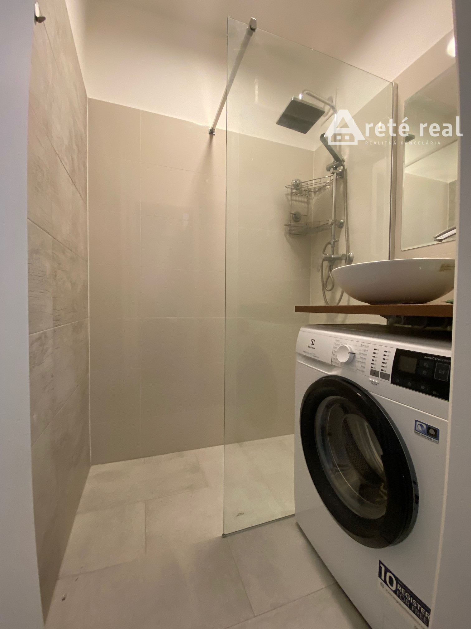 - kúpeľňa so zrkadlom, umývadlom a preskleným sprchovým kútom